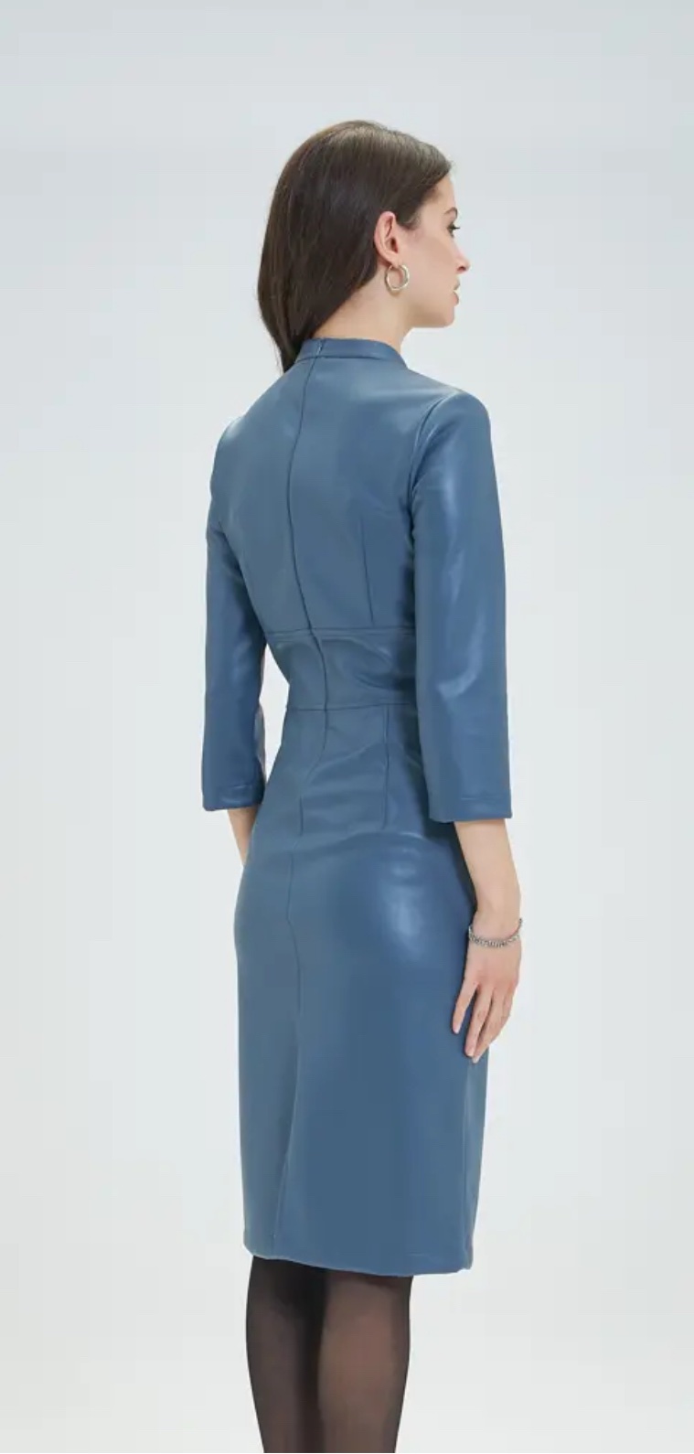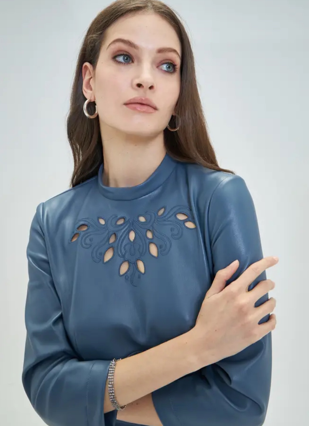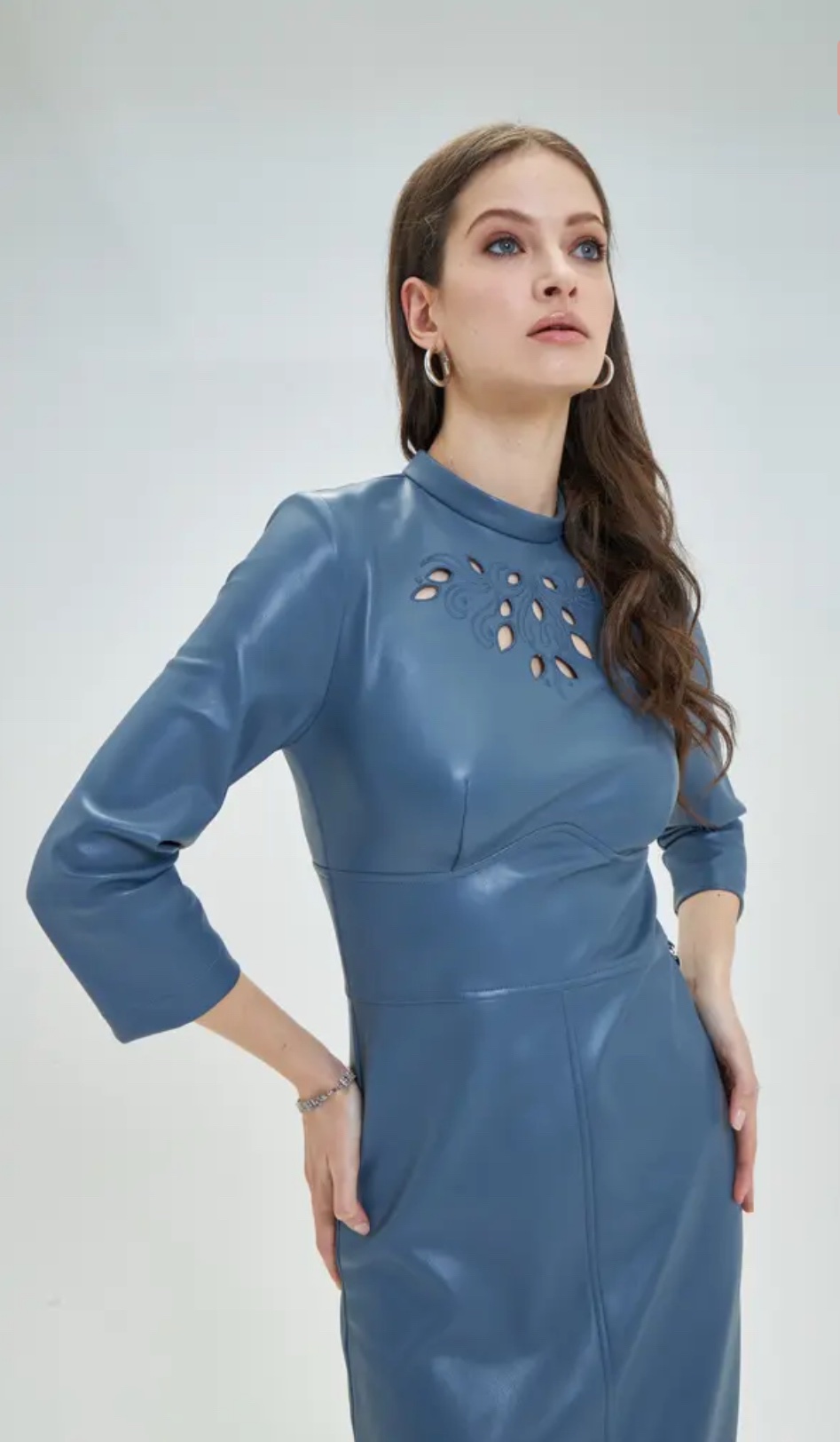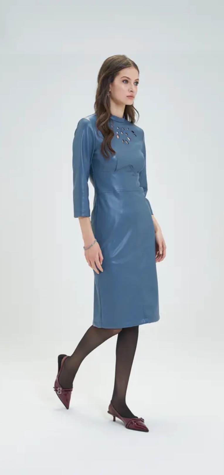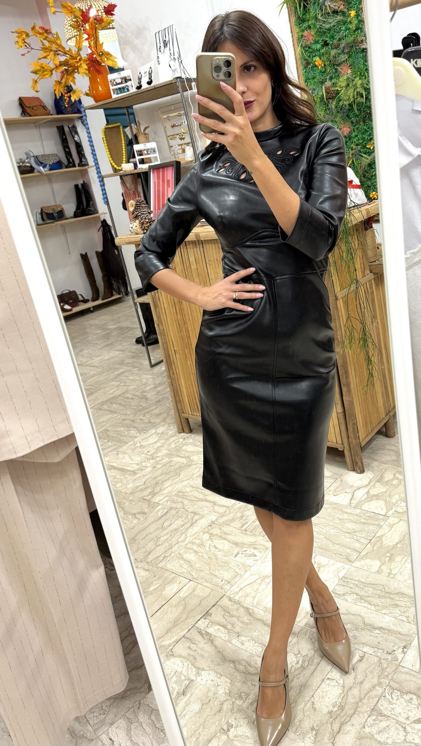 Tubino Goa Goa in ecopelle, con maniche a 3/4, chiusura con zip sulla schiena, ricamo traforato sul petto.