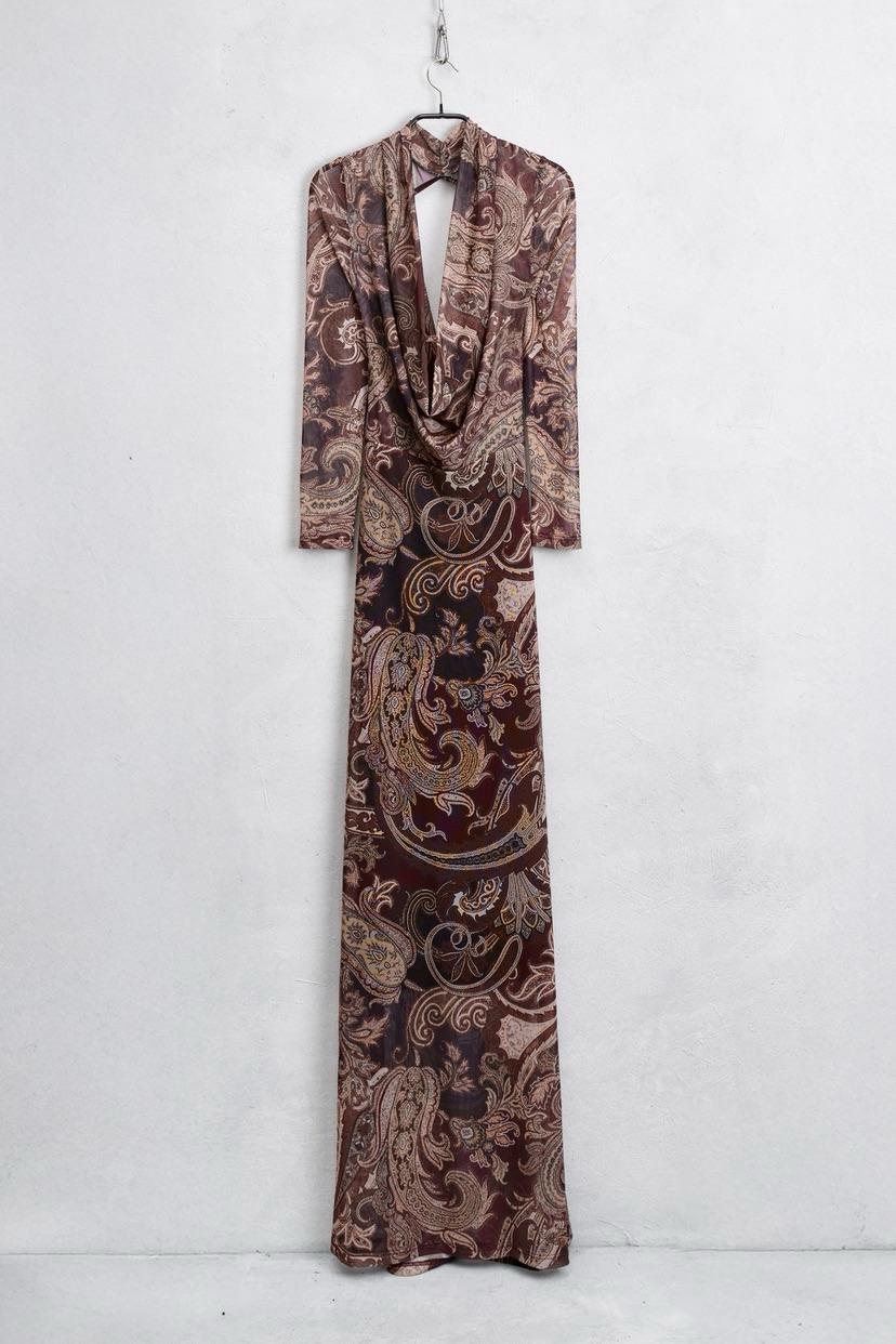 Abito lungo in tulle, fantasia jacquard, con scollo a V morbido, scollo sul retro, tg unica.