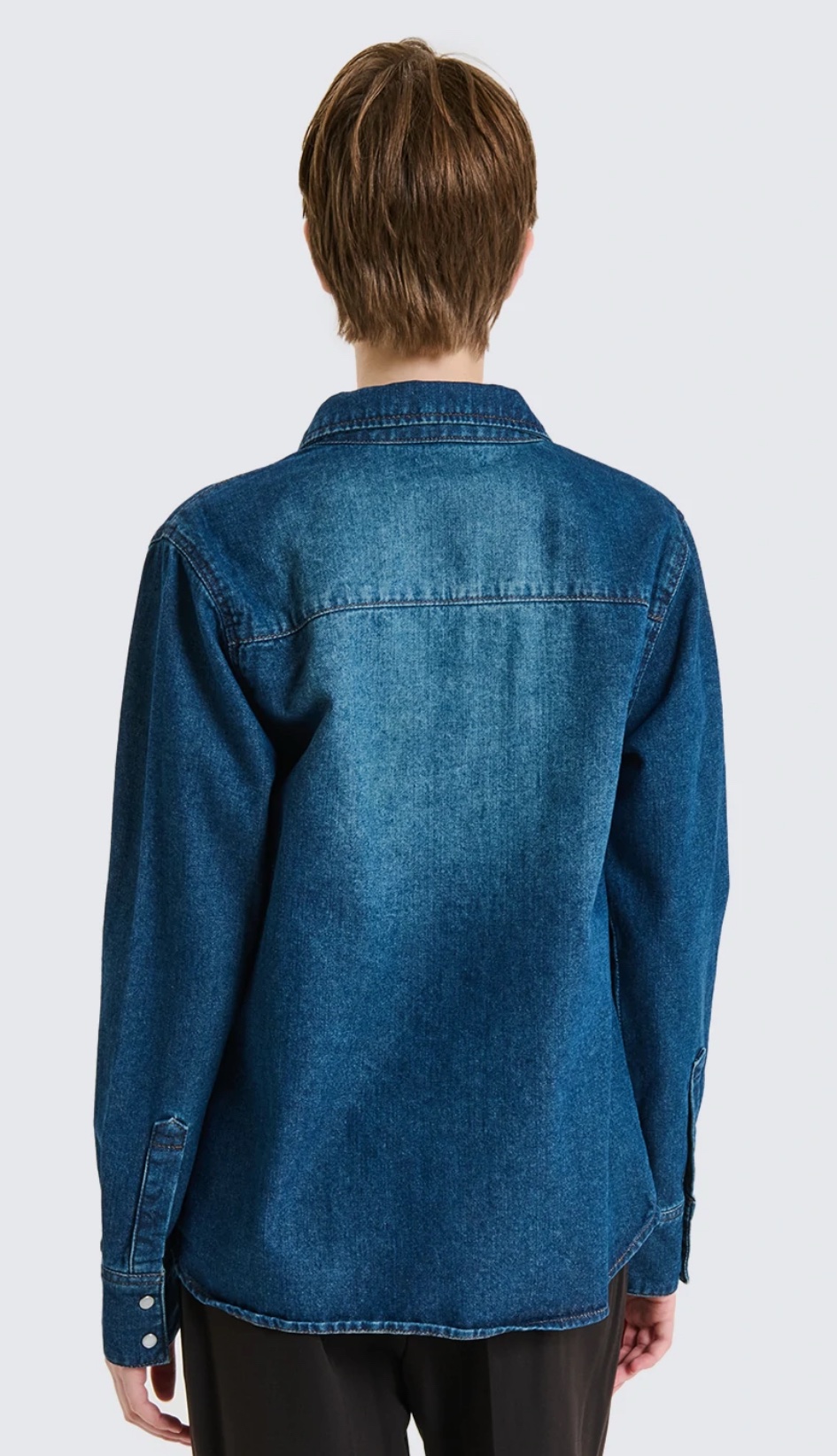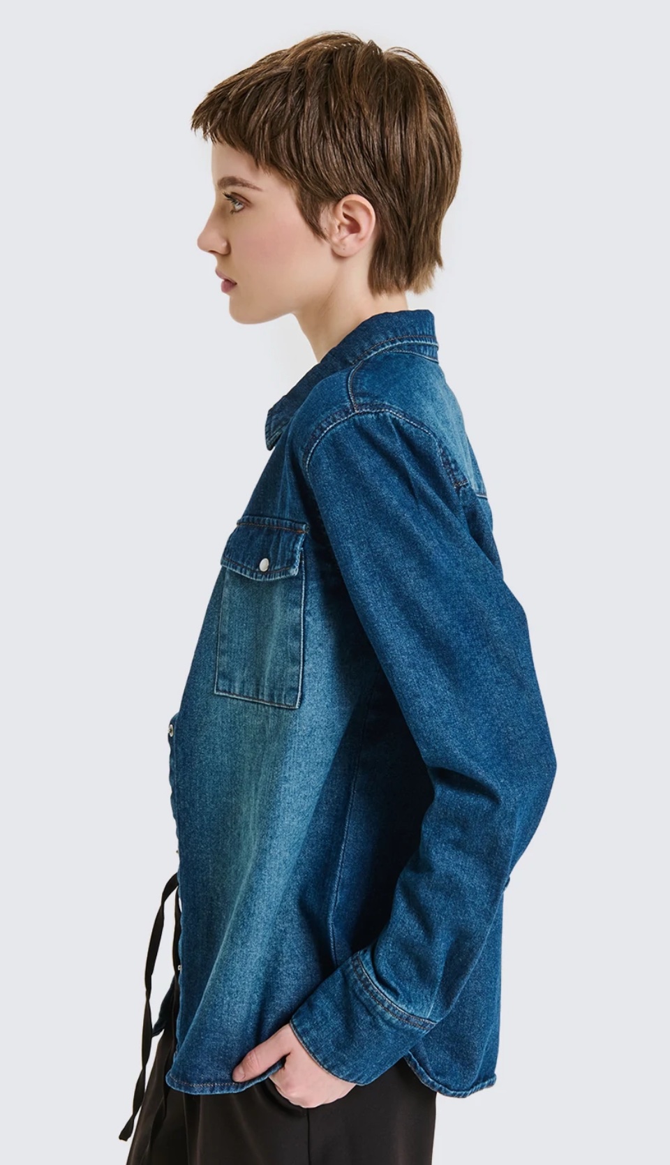 Camicia modello in denim slavato, in 100% cotone, chiusura con bottoni, manica lunga, tasche sul davanti.