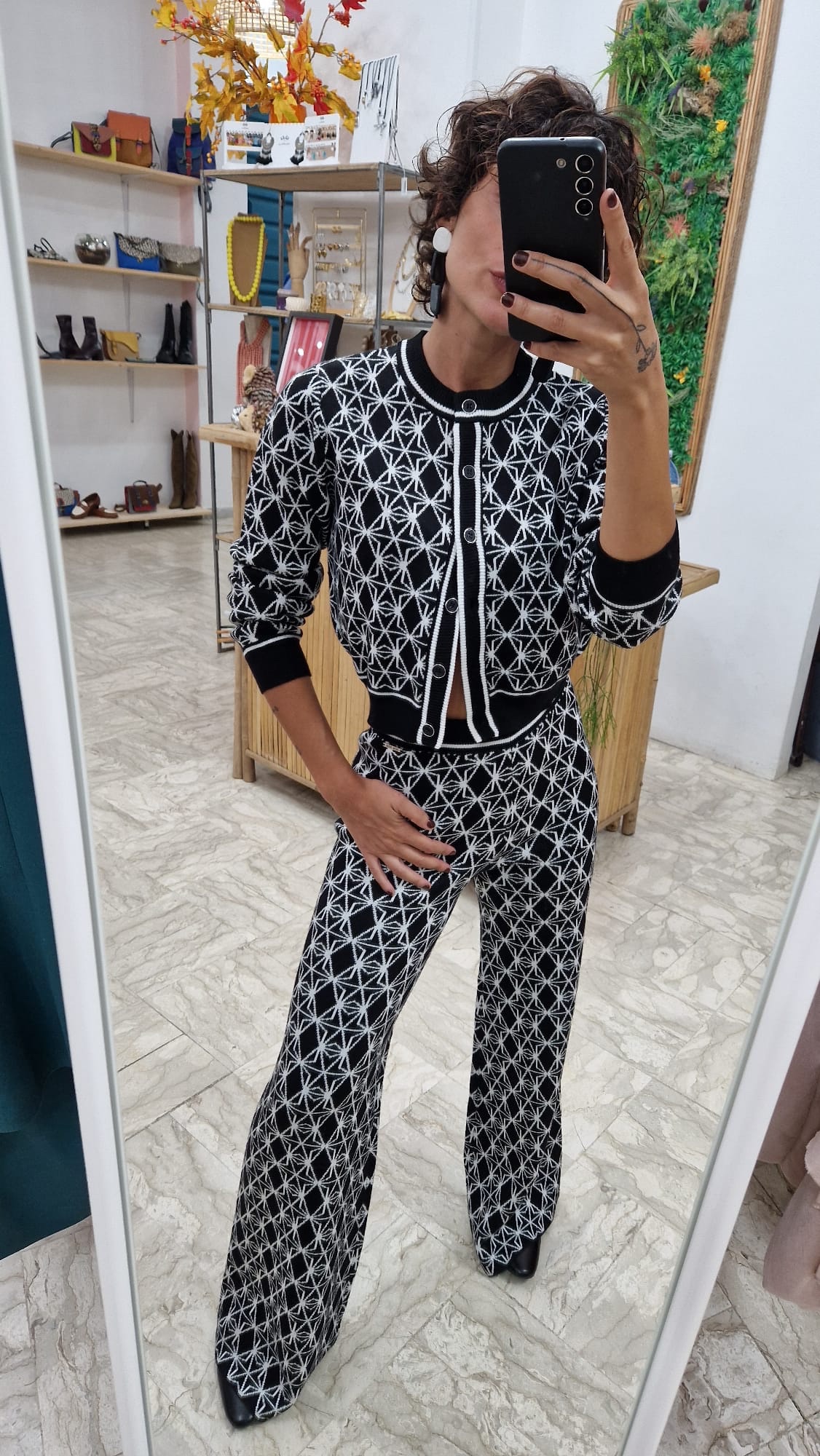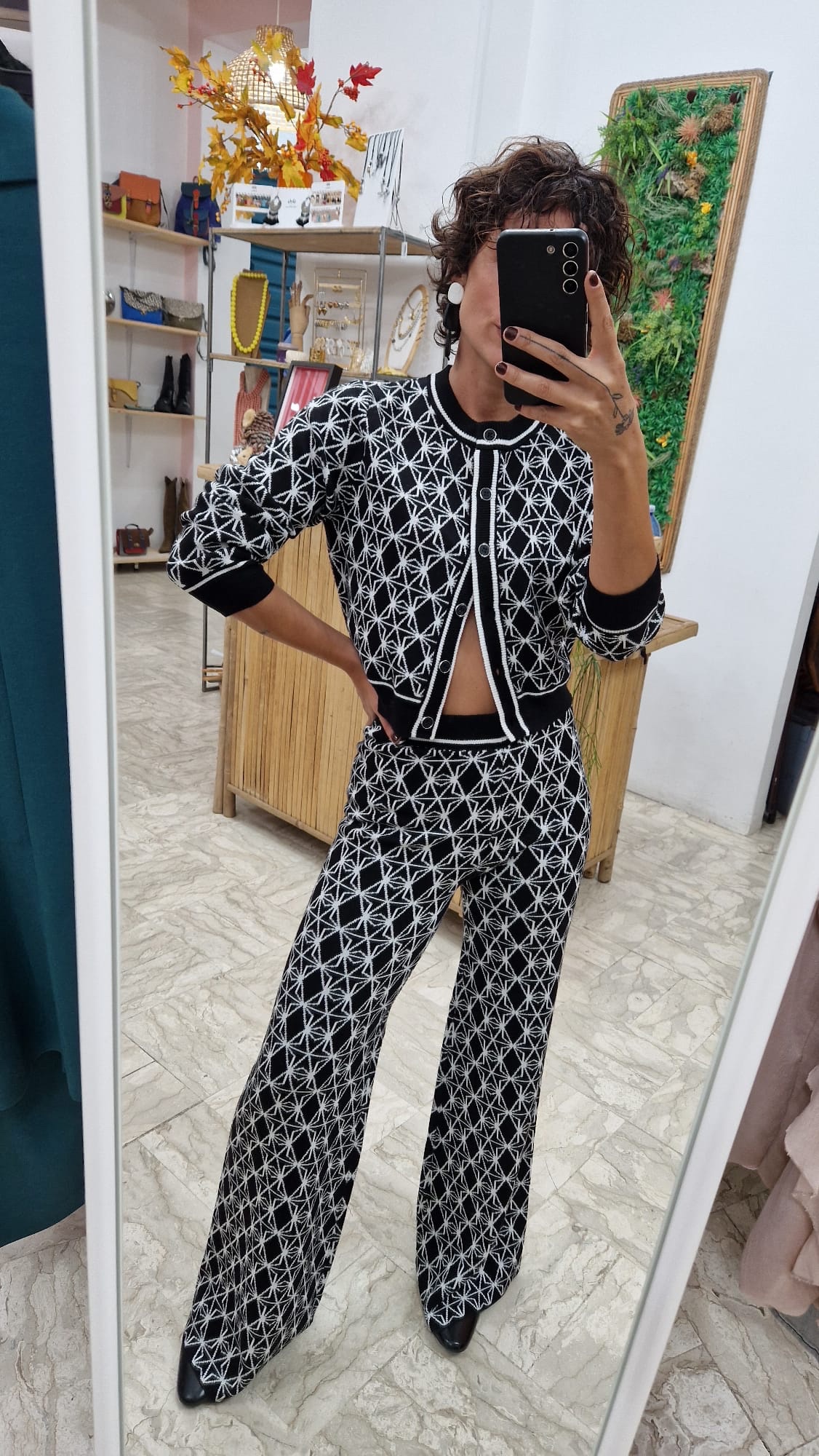 Completo Goa Goa in misto viscosa elasticizzato, con fantasia astratta, composto da pantalone a zampa e cardigan, da indossare anche come pull.