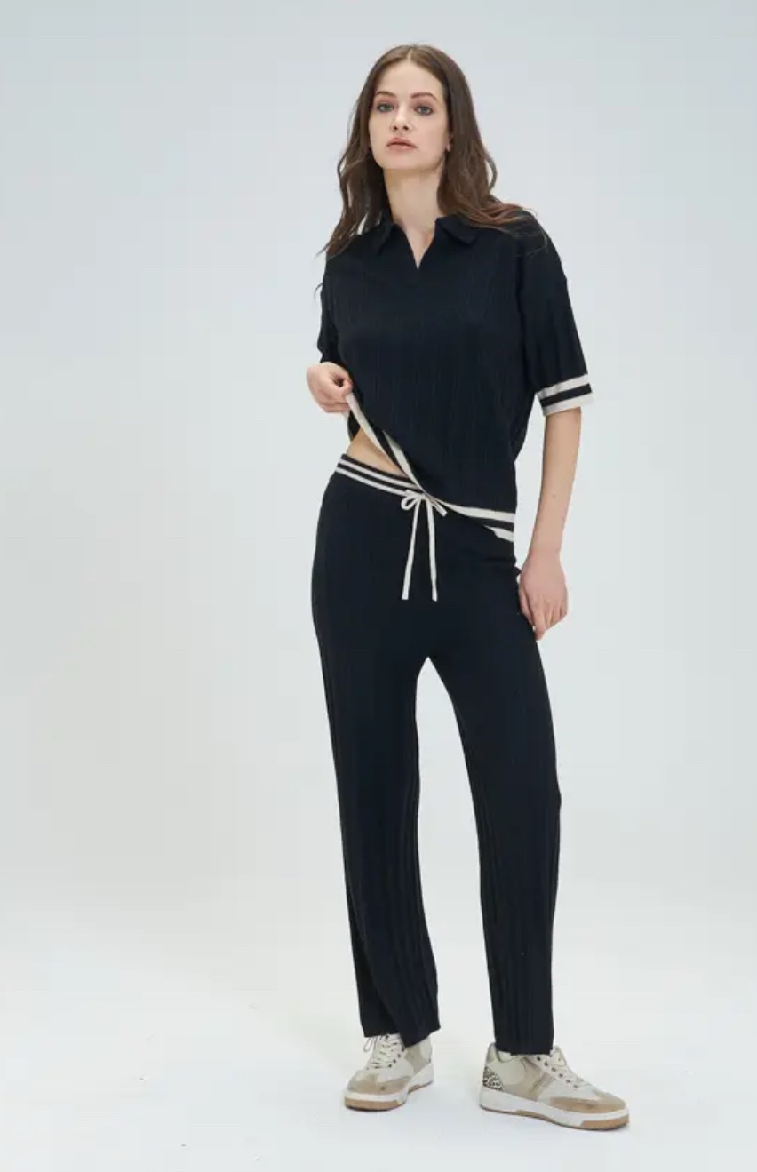 Completo Goa Goa misto lana, completamente elasticizzato composto da polo ricamata con fantasia su lunghezza manica e vita, pantalone con fantasia sulla molla in vita.