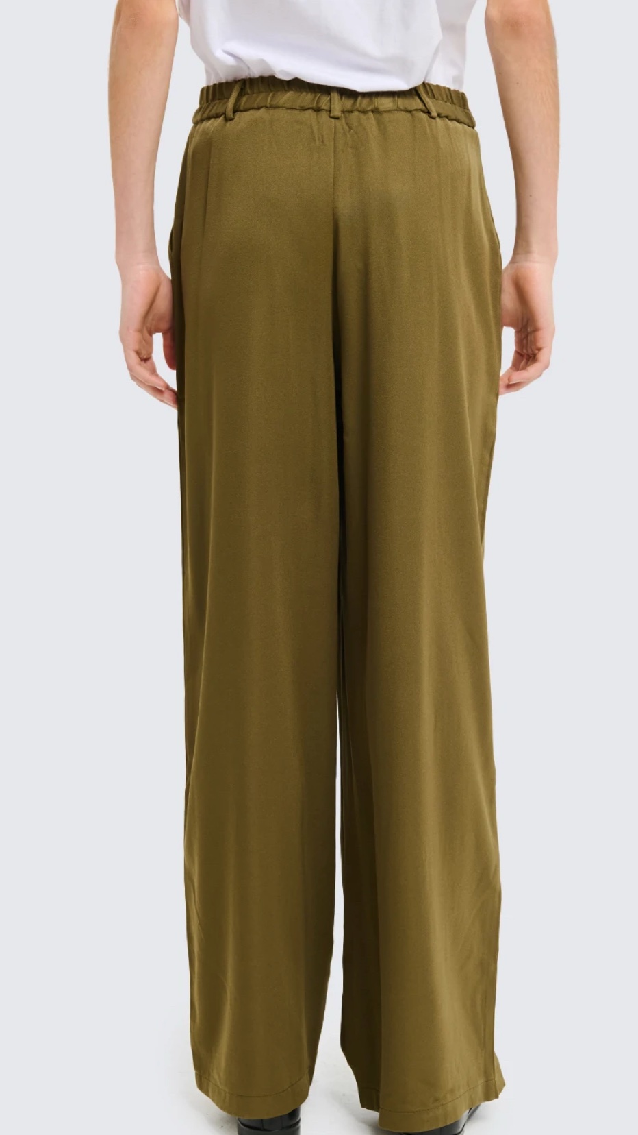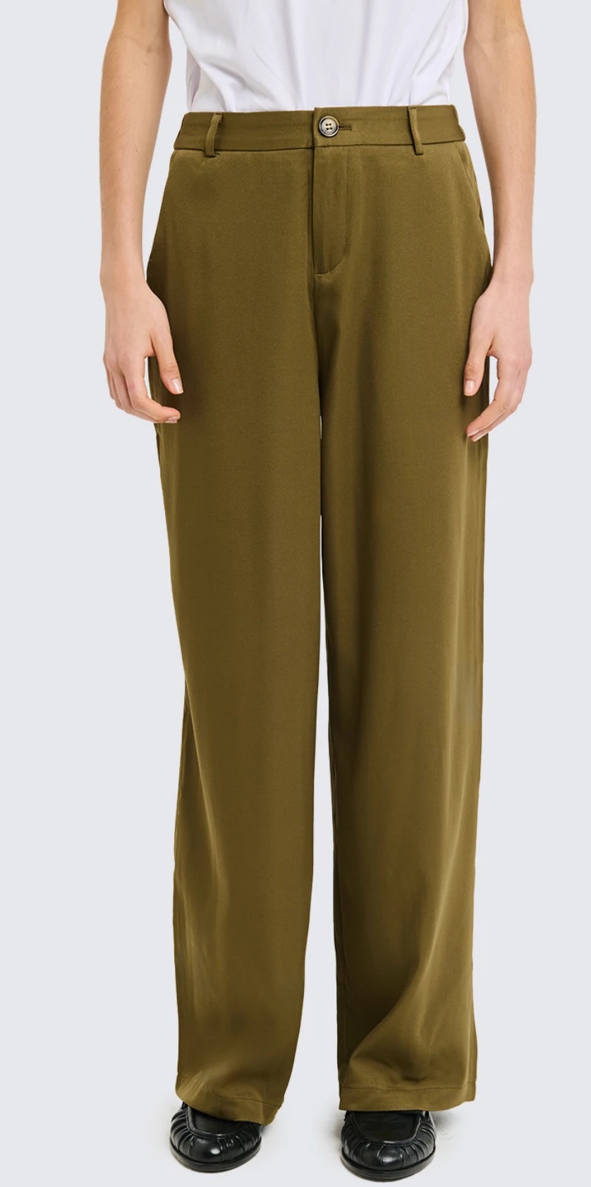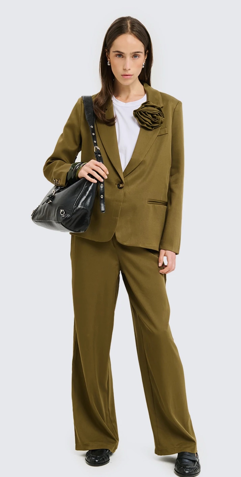 Tailleur composto da giacca monopetto, con spilla a fiore amovibile, pantalone con molla in vita a gamba ampia.