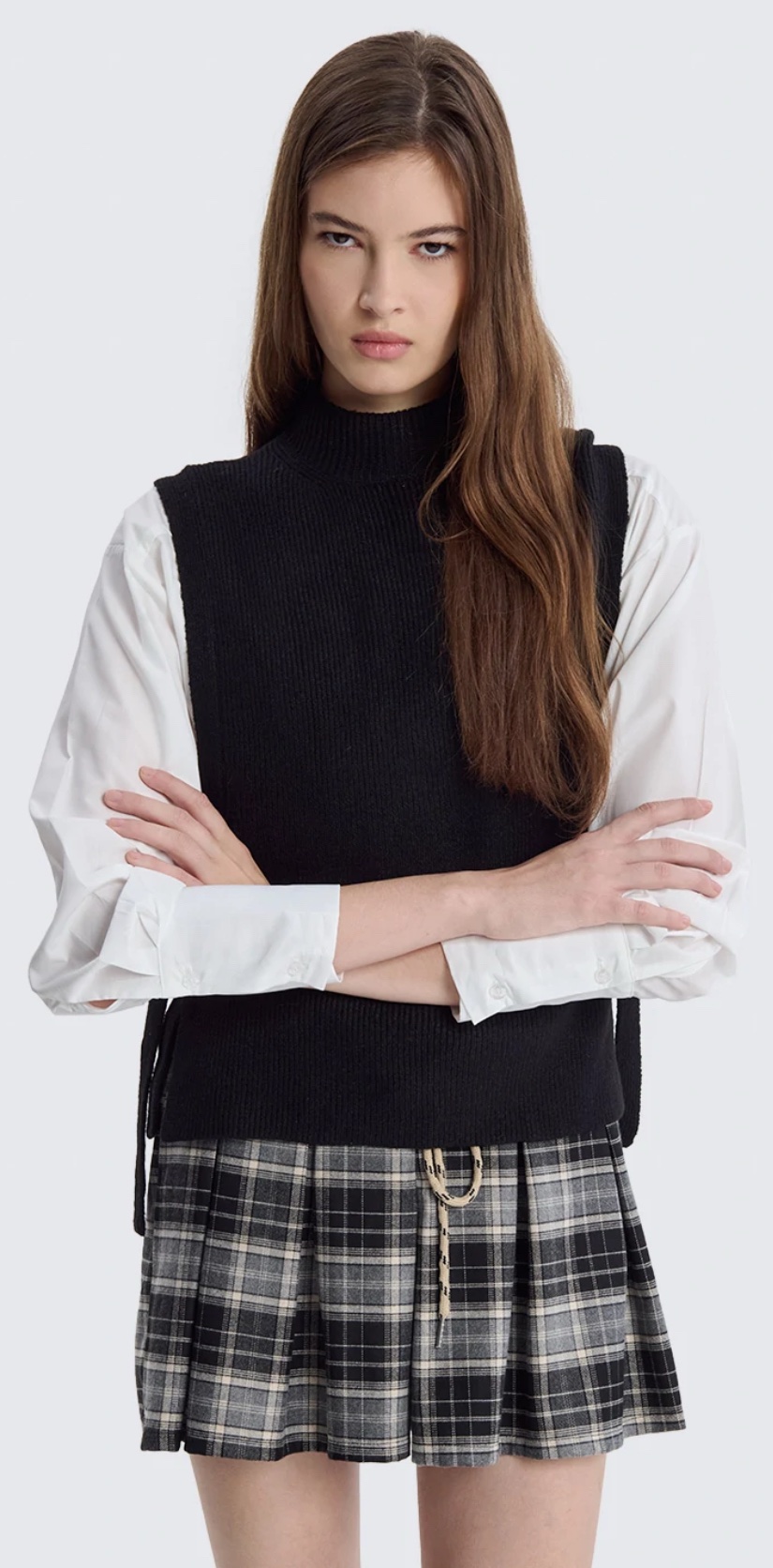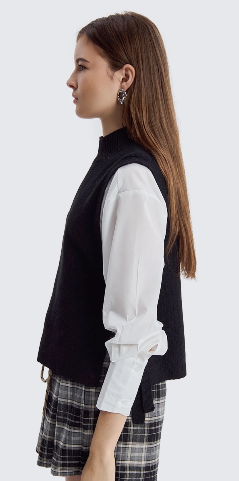 Gilet 85% lana, 15% mohair, con apertura laterale e laccetti, tg unica a girocollo.