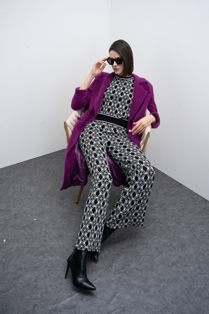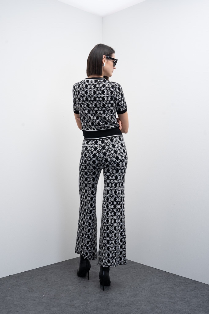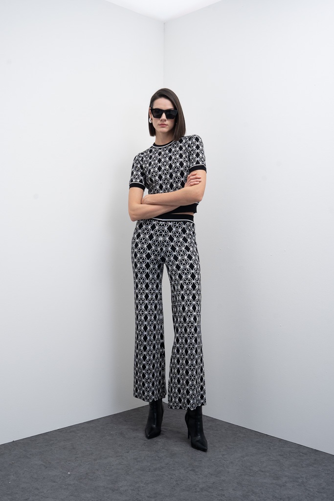 Pantalone palazzo elasticizzato in maglina, fantasia geometrica.