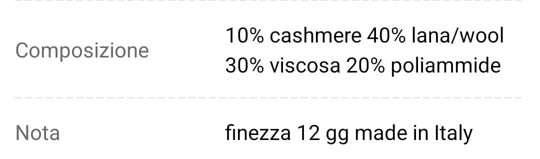 | Colore | verde oliva, Blu, Grigio, Moro, Nero, Panna |