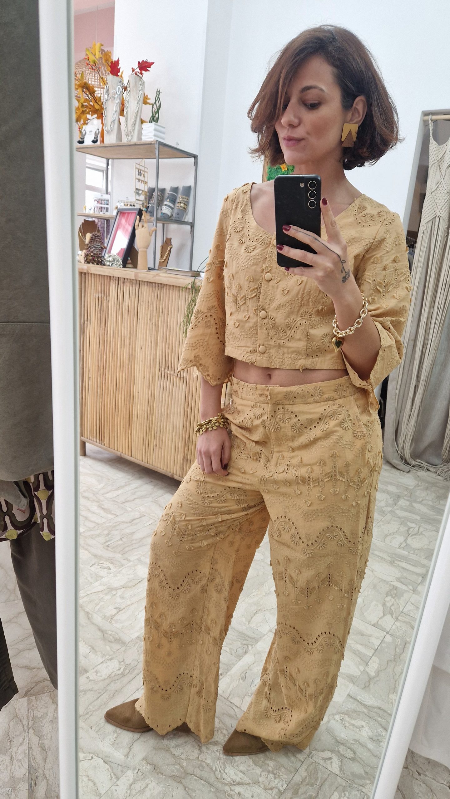 pantalone a gamba morbida in pizzo sangallo da poter abbinare alla camicia crop